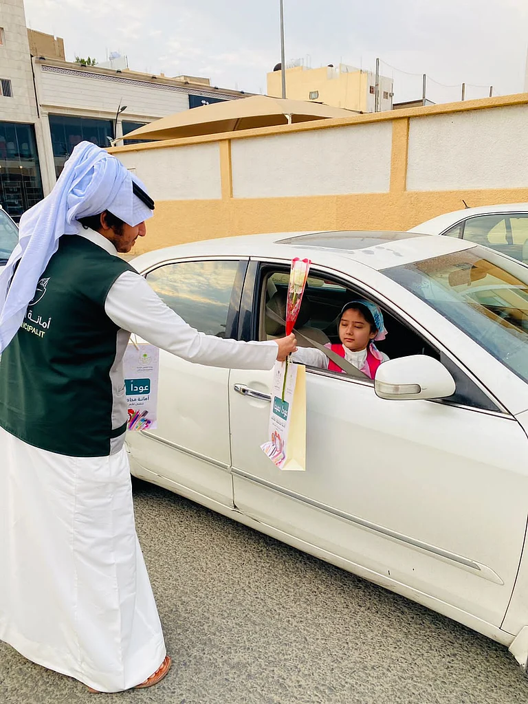 وانتشر عدد من منسوبي الأمانة عند الإشارات الضوئية المرورية وبالقرب من المدارس يحملون الورود والهدايا، والابتسامة تعلو محياهم برؤية الطلاب والطالبات يعودون إلى مقاعدهم الدراسية.
